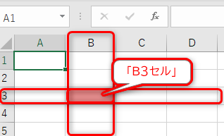 例えば、B列の3行目にあるセルは、セル番地が「B3」となります。