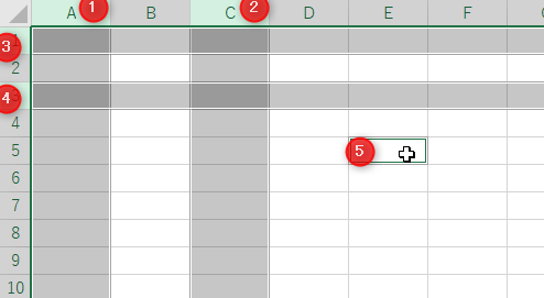 [A列]をクリック→[Ctrl]キーを押しながら[C列]をクリック→ [Ctrl]キーを押しながら [1行]をクリック→ [Ctrl]キーを押しながら[3行]をクリック→ [Ctrl]キーを押しながらセル[E5]をクリック