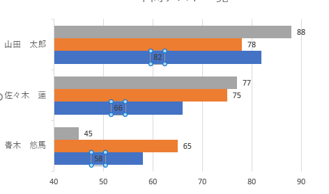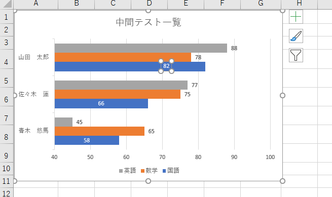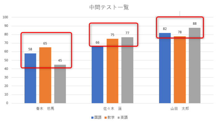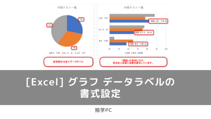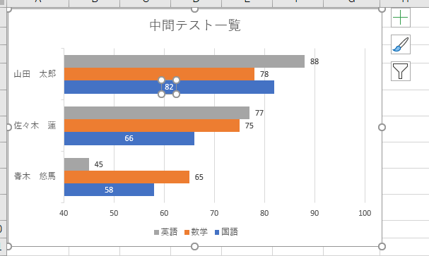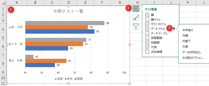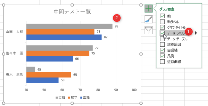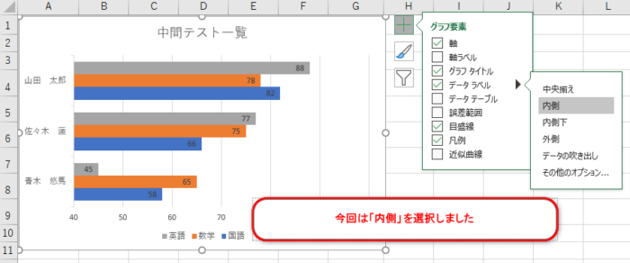 グラフを選択→[書式]→[グラフエリア]の下向き▼をクリック→「系列”国語”データラベル」をクリック