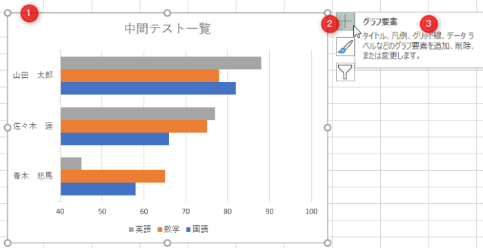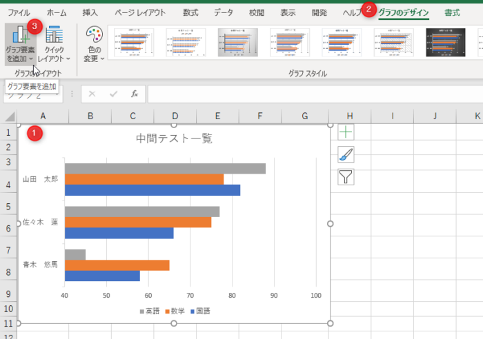 グラフをクリックして選択→「+」のグラフ要素をクリック