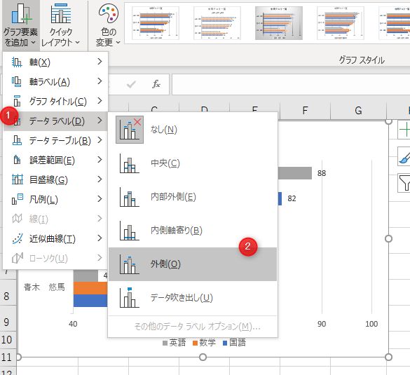「データラベル」をクリック→「外側」などをクリック