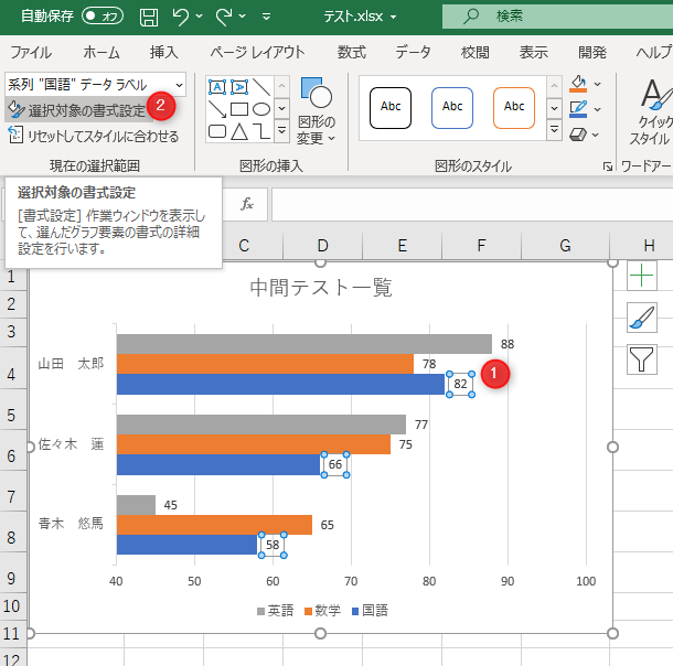 「国語」のデータラベルのみが選択される→[選択対象の書式設定]をクリック