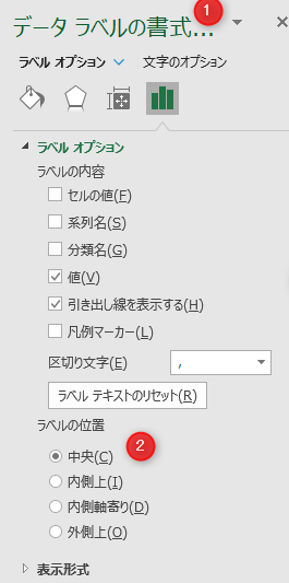 「データラベルの書式設定」が表示される→「ラベルの位置」で「中央」などをクリック