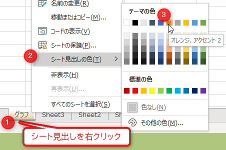 ここでは「グラフ」というシートをオレンジアクセント2に設定します。