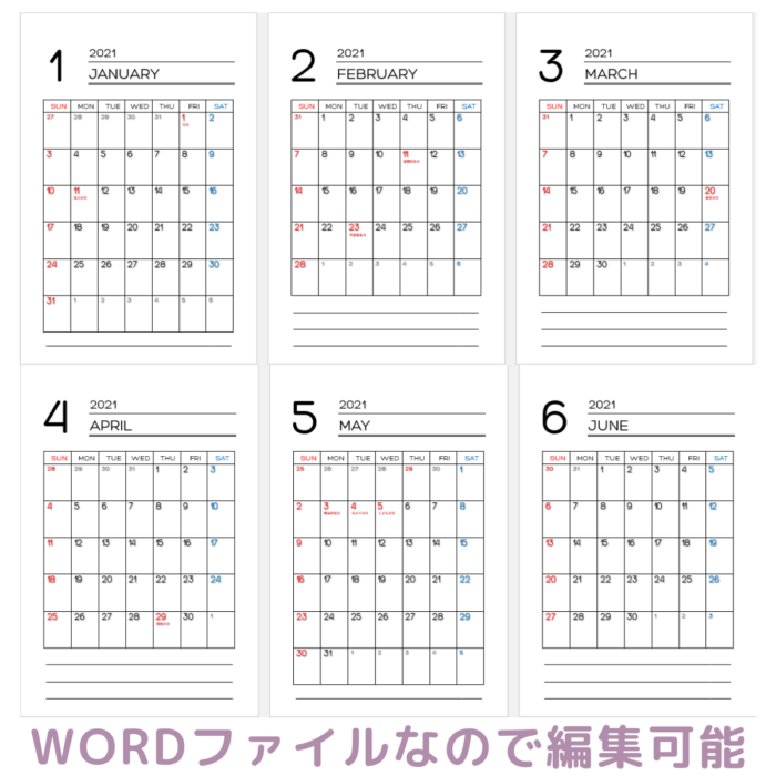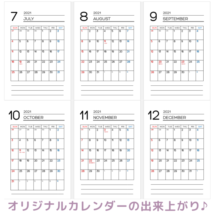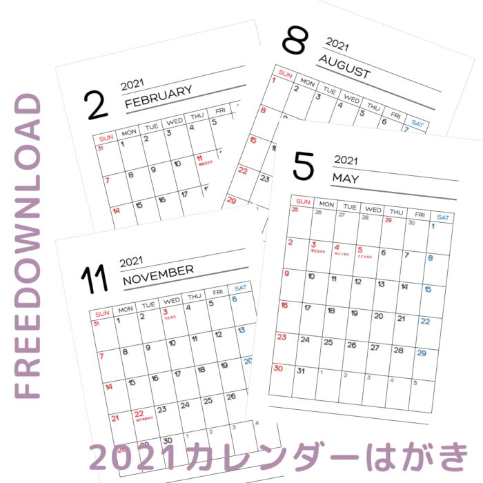 2021年のカレンダーです。