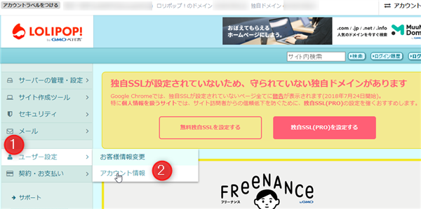 ログイン後の左側メニューの①「ユーザー設定」→②「アカウント情報」をクリック