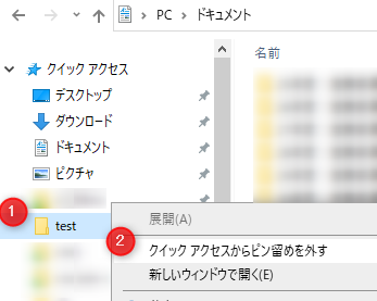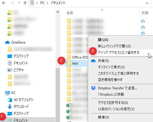 ①「ドキュメント」をクリック→②「test」を右クリック→③「クイックアクセスにピン留めする」をクリック