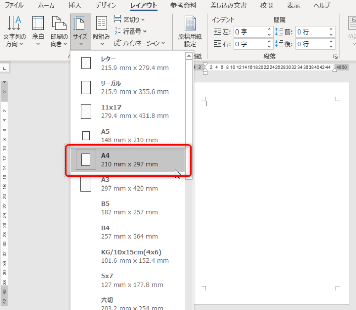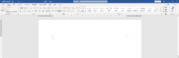 ワードの初期設定では、最初に新規文書(白紙の文書)を作成した場合は自動的にA4サイズの用紙が開きます。