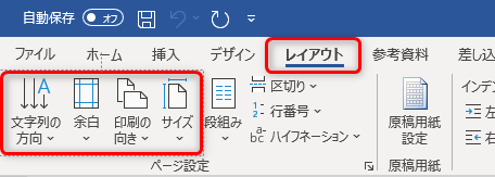 「文字列の方向」「余白」「印刷の向き」「サイズ」を設定しましょう。