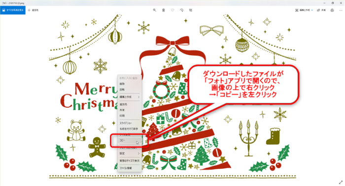 ダウンロードしたファイルが「フォト」アプリで開くので、画像の上で右クリック→「コピー」を左クリック