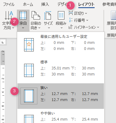 ワードで白紙の文書を開き、余白を狭いにする