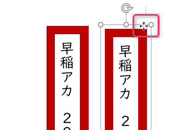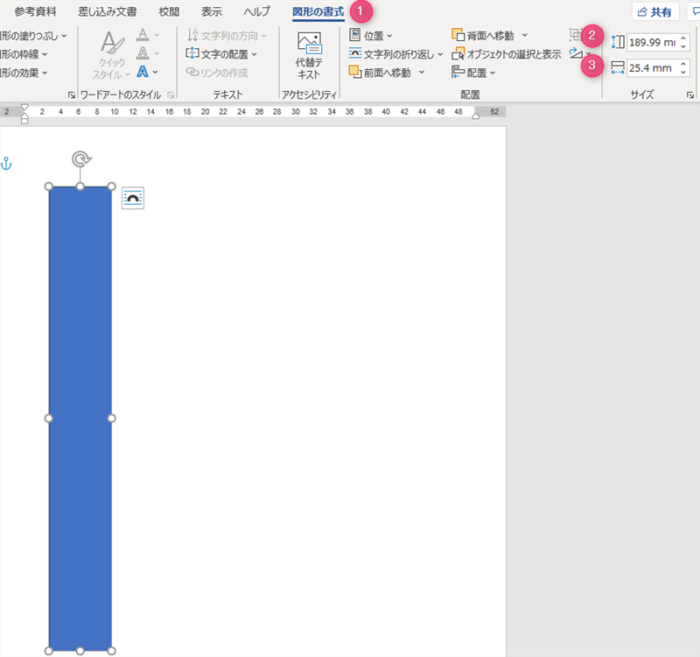 図形を選択し、図形の書式 → サイズグループの縦に180、横に15と入力します。