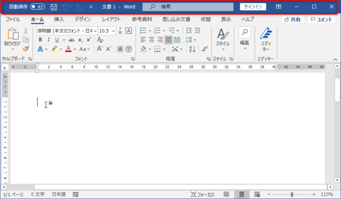ワードを新規(白紙の文書)で開くと、いよいよワードの編集画面になります。